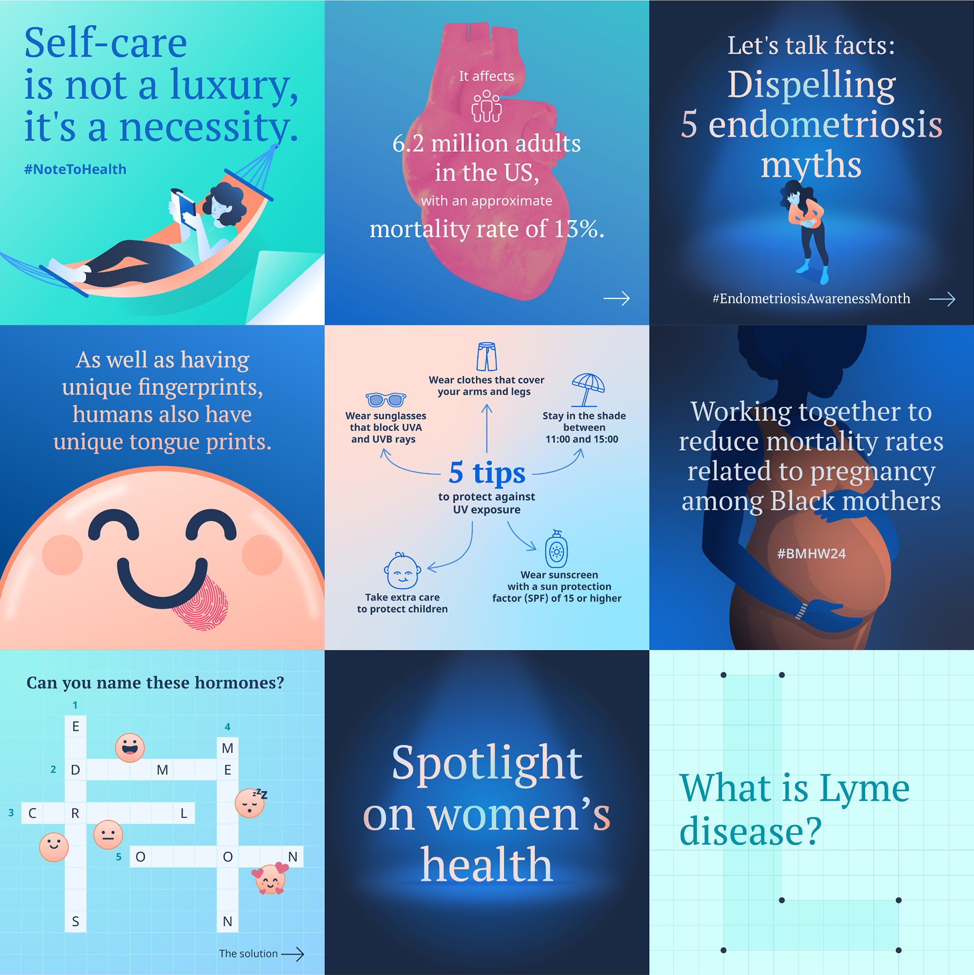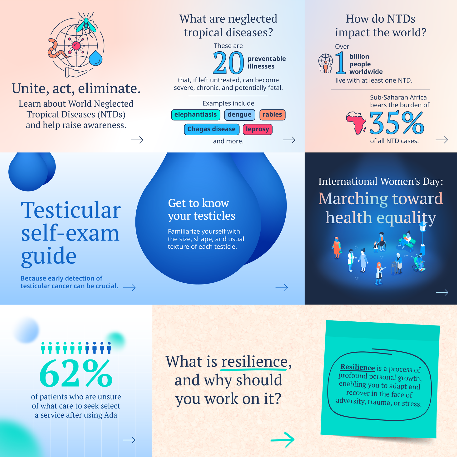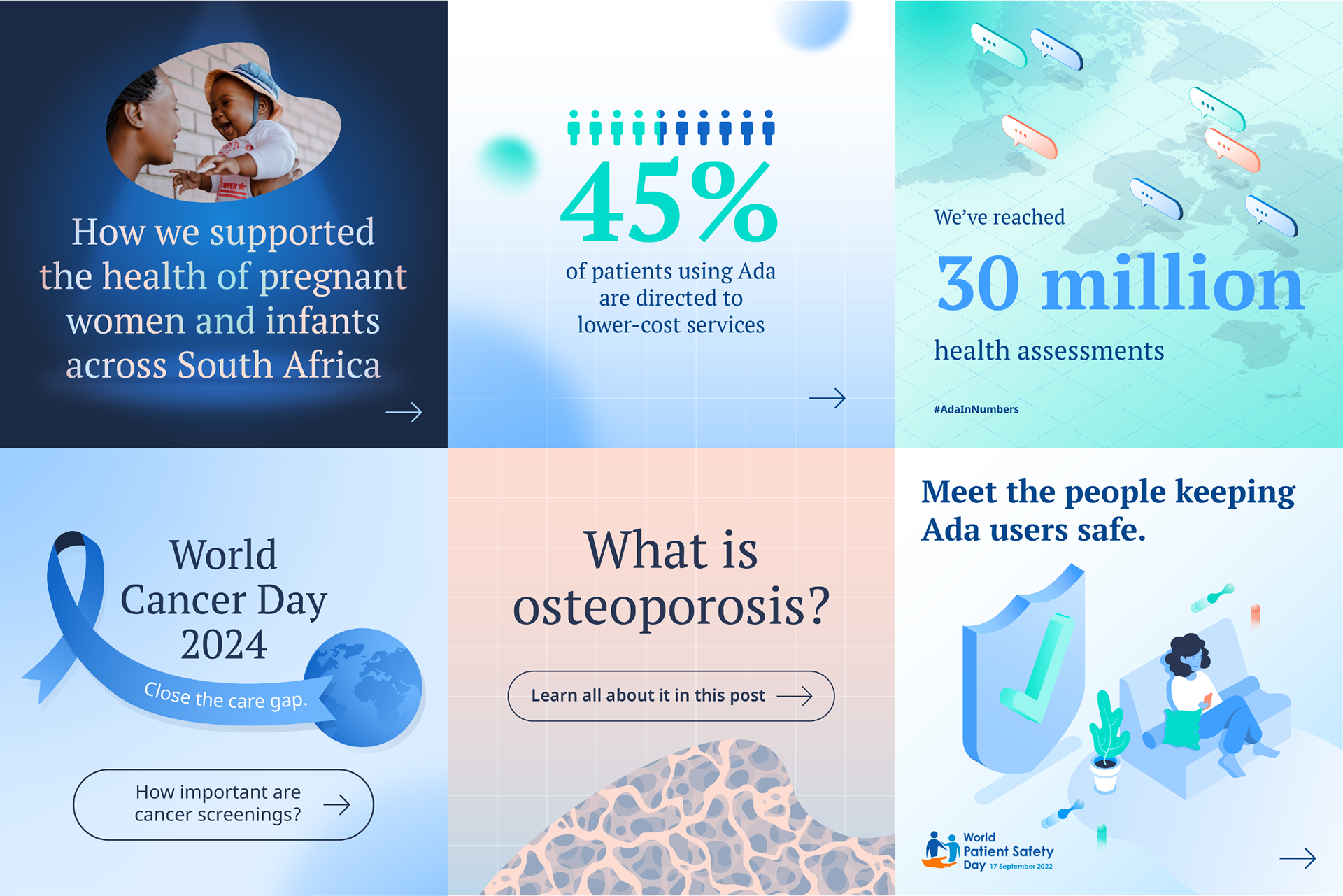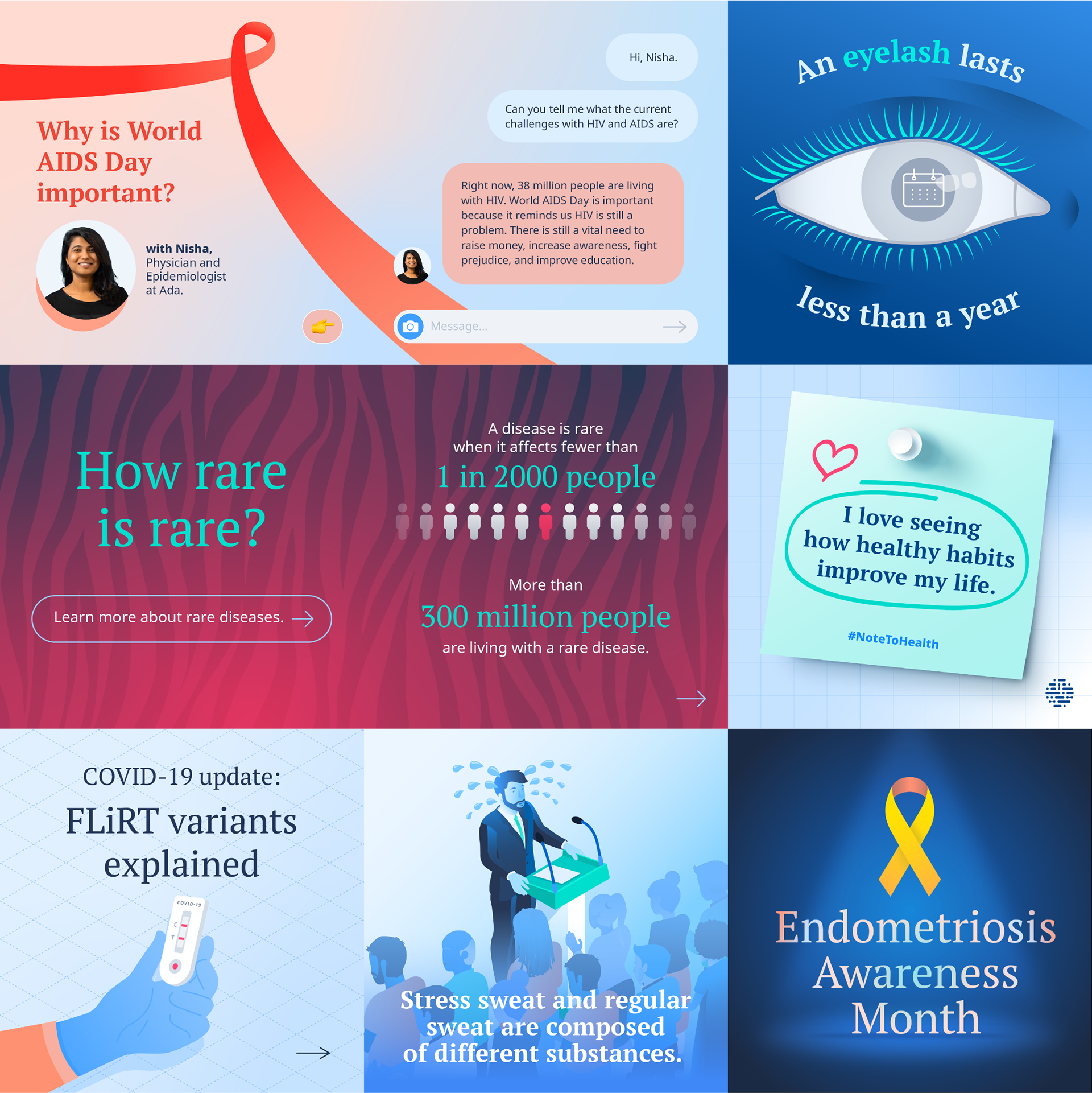 Social content developed for Ada Health for both B2B and B2C audiences. Graphic design, illustration & motion design.